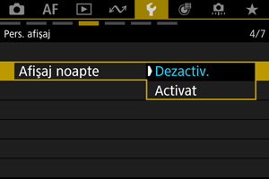 Modificaţi culoarea pentru informaţiile afişate pe ecran şi meniurile cu o culoare care să se potrivească fotografierii în condiţii de luminozitate scăzută.