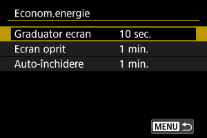 - Apoi aparatul se va opri automat în timpul afişării meniului sau redării imaginilor după ce trece timpul setat la [Graduator ecran], [Ecran oprit] şi [Închidere autom.].