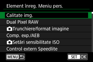 Puteţi schimba ordinea elementelor înregistrate în Meniul personal. Selectaţi [Sortare elem. înregistrate], selectaţi un articol pentru rearanjare, apoi apăsaţi