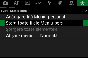 Puteţi şterge toate filele Meniu personal pe care le-aţi creat. Când selectaţi [Şterg toate filele Meniu pers], toate filele de la [MY MENU1] până la [MY MENU5] vor fi şterse şi fila [] va reveni la valorile implicite.