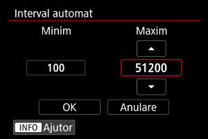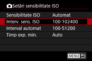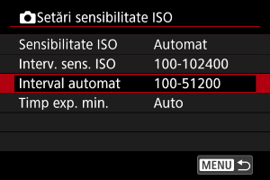 Puteţi seta intervalul ISO pentru Auto ISO.