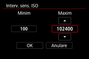 Puteţi seta intervalul de setare pentru ISO manual (limitele minime şi maxime).