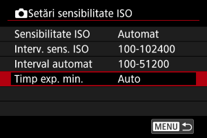 Pentru a preveni setarea automată a unui timp ce expunere prea lung, puteţi seta timpul de expunere minim pentru ISO auto.