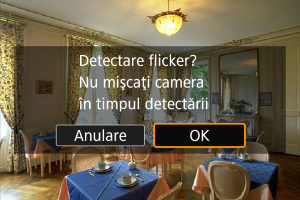 Aparatul detectează sursele de lumină 50.0–8193.7 Hz şi afişează un timp de expunere potrivit pentru fotografierea cu surse de lumină care pâlpâie la frecvenţe ridicate. Apoi puteţi trece la timpul de expunere indicat.