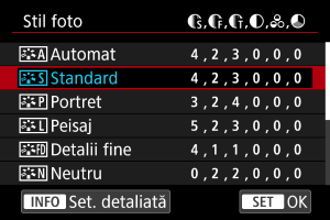 Puteţi adăuga un stil nou folosind ca bază [Portret] sau [Peisaj] sau un fişier Stil foto şi apoi modificaţi-l după cum doriţi (). Cu oricare dintre Stilurile foto definite de utilizator care nu a fost înregistrat, imaginile vor fi realizate cu aceleaşi setări ca setările implicite pentru [Standard].