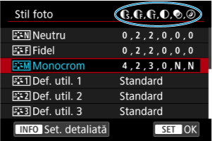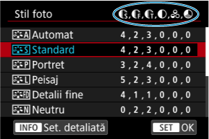 Simbolurile pentru selectarea Stilului Foto reprezintă [Intensitate], [Fineţe] şi [Val. limită] pentru [Claritate] şi [Contrast] şi alţi parametri. Numerele indică valorile setate pentru acele setări aşa cum sunt setaţe pentru Stilul foto respectiv.