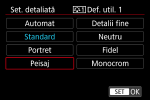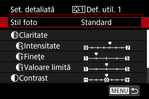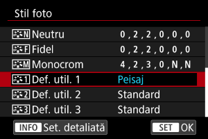 Puteţi selecta un Stil foto de bază precum [Portret] sau [Peisaj], puteţi regla parametrii acestuia după cum doriţi şi să îl înregistraţi la [Def. util. 1] – [Def. utilizator 3]. Folositor când doriţi să creaţi mai multe Stiluri foto cu setări diferite.