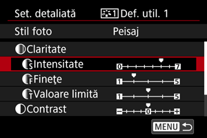 - Dacă un Stil foto a fost deja înregistrat la [Def. util. *], modificarea Stilului foto de bază va anula setările de parametrii ale Stilului foto definit de utilizator înregistrat anterior.