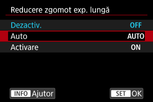 Reducerea zgomotului va fi realizată pentru toate expunerile de 1 secundă sau mai lungi. Setarea [Activare] poate reduce zgomotul care nu poate fi detectat de setarea [Auto].