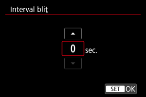 - Când setaţi la [0], bliţurile Speedlite compatibile declanşează şi aparatul fotografiază imediat ce bliţurile Speedlite sunt încărcate. Consultaţi manualul de instrucţiuni al bliţurilor Speedlite compatibile pentru precauţii la declanşarea continuă. Luaţi în calcul setarea unui interval mai mare când folosiţi mai multe bliţuri Speedlite compatibile la fotografierea cu bliţ wireless.