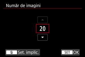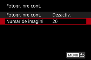 Cu această funcţie, fotografierea automată în modul de fotografiere continuă este deja în desfăşurare înainte de a apăsa complet butonul declanşator, după ce l-aţi apăsat până la jumătate pentru o clipă. Pentru a vă pregăti pentru fotografierea pre-continuă, setaţi numărul de imagini de capturat. Ţineţi cont că [] este afişat pe ecranul de fotografiere în timpul fotografierii pre-continue.