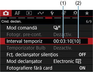 - În timpul fotografierii cu interval temporizare, nu puteţi folosi Înregistrare cu telecomandă sau fotografierea de la distanţă folosind un bliţ Speedlite.