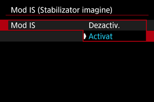 - Selectaţi [Activ] pentru a folosi modul IS de pe aparat.