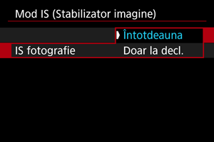 Acest meniu este afişat pentru configurarea setărilor pentru modul IS al aparatului când folosiţi un obiectiv non-IS. Cu obiective cu IS, setarea comutatorului Image Stabilizer (Stabilizator de imagine) al obiectivului la combină stabilizarea obiectivului cu cea a aparatului foto.