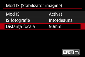 Stabilizarea imaginii în funcţie de distanţa focală specificată este posibilă dacă setaţi distanţa focală când folosiţi obiective care nu sunt compatibile cu comunicarea.