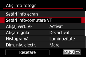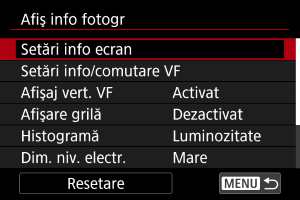 pentru a selecta ecranele cu informaţii pe care să le afişaţi pe aparat.