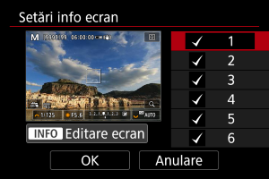 pentru a selecta opţiunile pe care să le afişaţi pe ecranul cu informaţii.