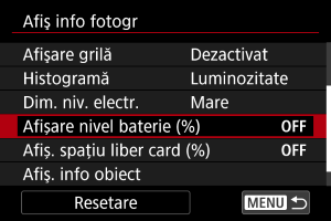 Puteţi afişa capacitatea rămasă a bateriei pe ecran sub forma unei pictograme şi a unui procent (1-100%).