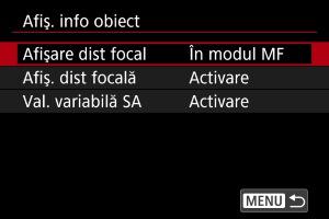 Puteţi afişa distanţa de focalizare când folosiţi obiective RF sau RF-S. În afişajul cu distanţa de focalizare, puteţi selecta intervalul de timp şi unitatea de măsură.