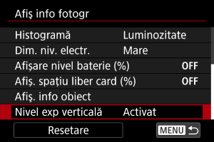 Puteţi selecta cum sunt afişate informaţiile în vizor când fotografiaţi vertical.