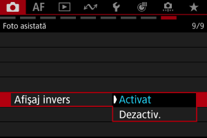 O imagine în oglindă poate fi afişată când fotografiaţi cu ecranul rotit către subiect (către partea din faţă a aparatului).