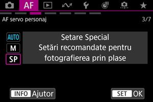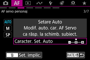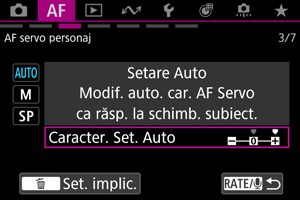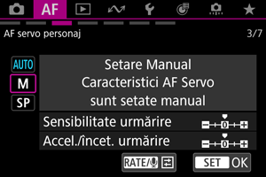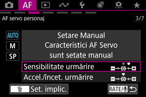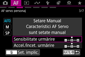Puteţi seta parametrii de urmărire AF Servo (sensibilitate urmărire subiect şi accelerare/decelerare urmărire) pentru subiect şi situaţia de fotografiere.