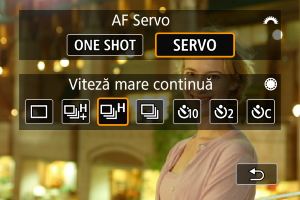- Viteza la fotografiere continuă cu AF Servo poate scădea în funcţie de condiţiile subiectului şi de obiectivul folosit.