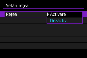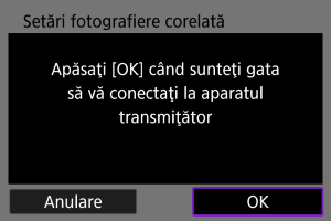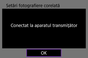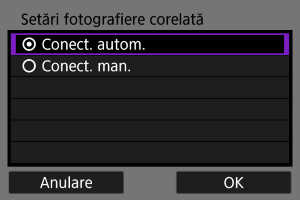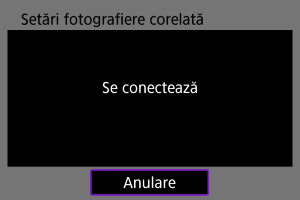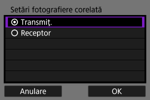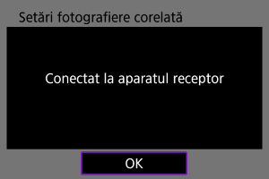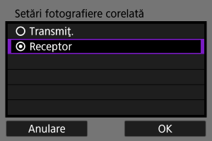 - Dacă nu veţi mai utiliza o cameră receptor în înregistrarea corelată, setaţi [Foto.corel] în [Setări conectare] pe camera receptor la [Deconectare].