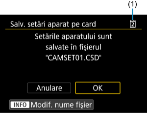 - Până la zece fişiere cu setări pentru aparat pot fi salvate pe un card. Dacă pe card sunt deja zece fişiere cu setări pentru aparat puteţi fie suprascrie un fişier existent sau să folosiţi alt card.