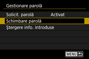 Puteţi modifica parola pe care trebuie să o introduceţi când butonul de alimentare este setat la sau când camera reia operarea din închiderea automată.