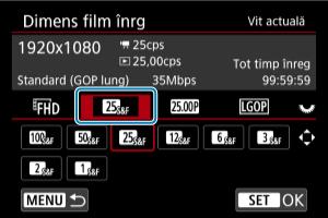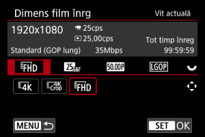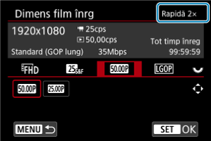Filmele înregistrate folosind înregistrare slow sau fast motion sunt redate în slow sau fast motion. Sunetul nu este înregistrat. Setaţi viteza (de redare) slow sau fast motion în [: Dimens.film înrg.].