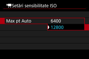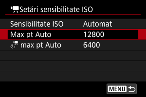 ], puteţi seta manual valoarea ISO. Puteţi selecta şi ISO Auto.