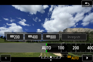 - Puteţi înregistra setările pentru sensibilitate ISO folosite frecvent prin specificarea unei alte opţiuni decât [AUTO] şi selectând [Înregistr].