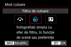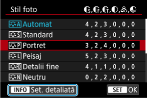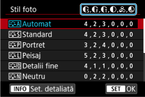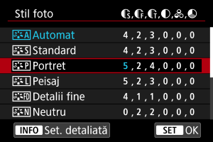- Selectaţi un Stil foto, apoi apăsaţi butonul INFO.