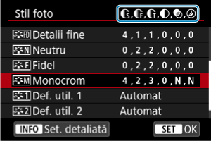Puteţi personaliza orice Stil foto prin modificarea faţă de valorile implicite. Pentru detalii despre personalizarea [Monocrom], Consultaţi Reglare monocrom.