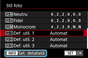 - Dacă un Stil foto a fost deja înregistrat la [Def. util. *], modificarea Stilului foto de bază va anula setările de parametrii ale Stilului foto definit de utilizator înregistrat anterior.