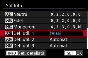 Puteţi selecta un Stil foto de bază precum [Portret] sau [Peisaj], puteţi regla parametrii acestuia după cum doriţi şi să îl înregistraţi la [Def. util. 1] – [Def. utilizator 3]. Folositor când doriţi să creaţi mai multe Stiluri foto cu setări diferite.