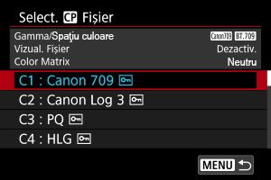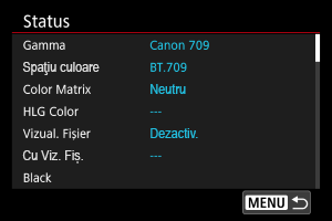- Nu puteţi folosi un Fişier aspect dacă modificaţi setările pentru [Gamma/Spaţiu culoare], [HLG Color] sau [Peste 100%] după înregistrare.