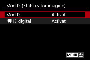 Activează stabilizarea imaginii folosind IS obiectiv. Afişat când este folosit un obiectiv fără comutator IS. Nu este afişat pentru alte obiective.