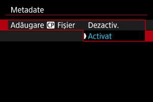 Fişierele imagine personalizată pot fi încorporate în fişierele film dacă setaţi [Adăugare Fișier] la [Activ] când [