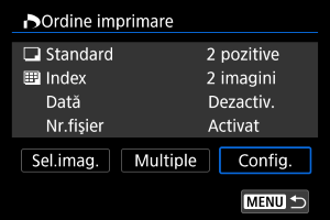 Puteţi seta anumite setări de imprimare precum tipul de imprimare, imprimarea datei, imprimarea numărului fişierului, etc. Setările de imprimare se vor aplica tuturor imaginilor specificate pentru imprimare. (Acestea nu pot fi setate individual pentru fiecare imagine în parte.)