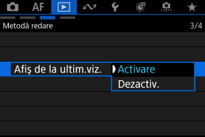 ]: Redarea se reia de la ultima imagine afişată (exceptând situaţia în care tocmai aţi terminat de fotografiat).