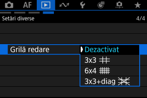 Puteţi afişa o grilă peste imaginile pe care le vizualizaţi când este afişată o singură imagine în ecranul de redare. Această funcţie este avantajoasă pentru verificarea distorsionării verticale şi orizontale, precum şi compunerea imaginii.