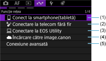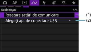 - Anumite elemente din meniu nu pot fi configurate în timp ce aparatul este conectat prin intermediul unui cablu de interfaţă la un calculator sau alt dispozitiv.