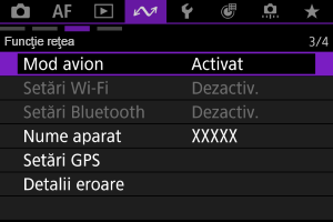 Dacă preferaţi să nu rămâneţi conectat la aparat prin Wi-Fi/Bluetooth când este oprit, fie setaţi [: Mod avion] la [Activat] sau setaţi [