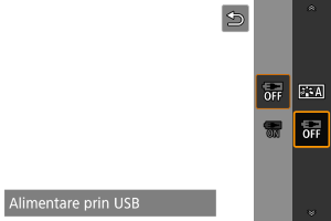 Dacă activaţi alimentarea prin USB, puteţi alimenta camera de la un calculator sau alt dispozitiv. Finalizaţi această setare după ce conectaţi dispozitivele prin USB.