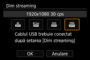 Puteţi seta dimensiunea pentru streaming. Finalizaţi această setare după ce conectaţi dispozitivele prin USB.
