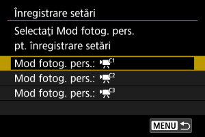 În modul , puteţi înregistra setările curente ale aparatului, precum setările pentru înregistrare, meniu şi Funcţiile personalizate, ca moduri de înregistrare personalizată, la modurile [C1] până la [C3].