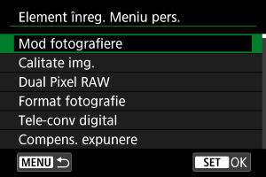 Puteţi schimba ordinea elementelor înregistrate în Meniul personal. Selectaţi [Sortare elem. înregistrate], selectaţi un articol pentru rearanjare, apoi apăsaţi
