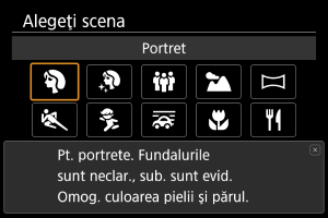 Folosiţi modul [] (Portret) pentru a face fundalul neclar şi pentru a scoate în evidenţă persoana pe care o fotografiaţi. De asemenea tonurile pielii şi ale părului vor părea mai naturale.